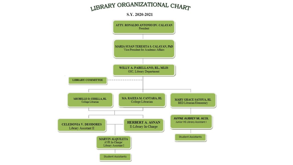 The Dr. Emeterio Calayan Jr. Library is a learning environment for the tertiary department that upholds the school’s mission to develop holistic, self-fulfilling, and productive citizens, actively engaged in national and international development via its library services by providing up-to-date information resources, instruction and technological services that promotes and enriches intellectual and personal growth to produce globally competitive professionals.
